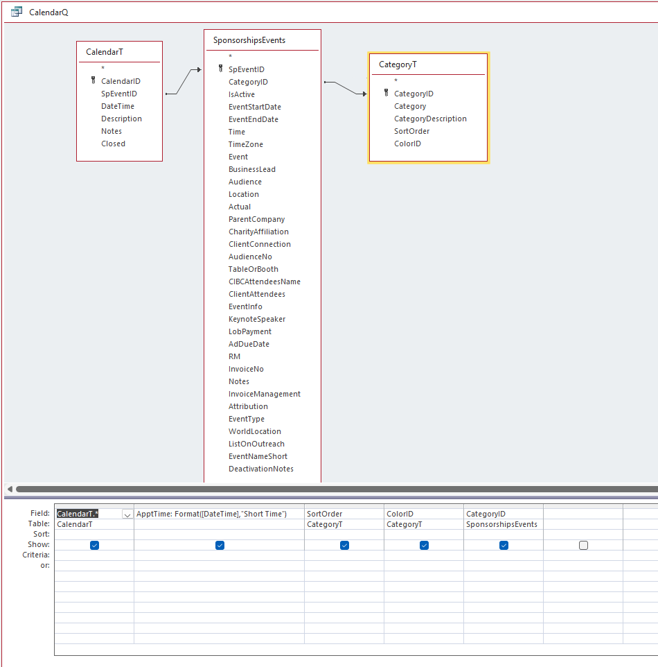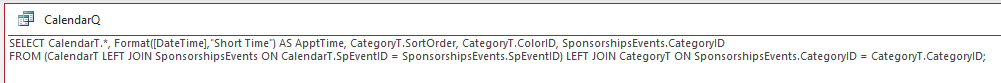 SQL = "SELECT CalendarID, CategoryID FROM CalendarQ  WHERE DateTime>=Forms!MainMenuF!StartDate+10 AND DateTime    MsgBox SQL