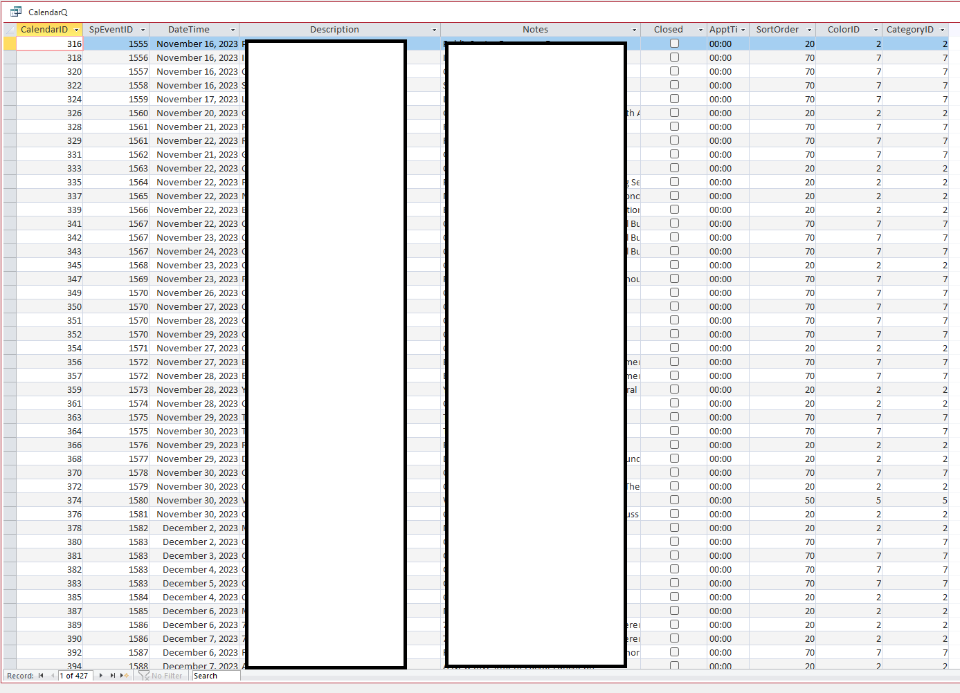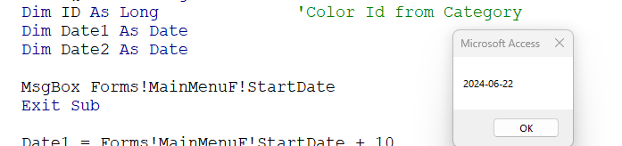 Set rsC = db.OpenRecordset("SELECT CalendarID, CategoryID FROM CalendarQ WHERE DateTime>=#" & Forms!MainMenuF!StartDate) & "#")