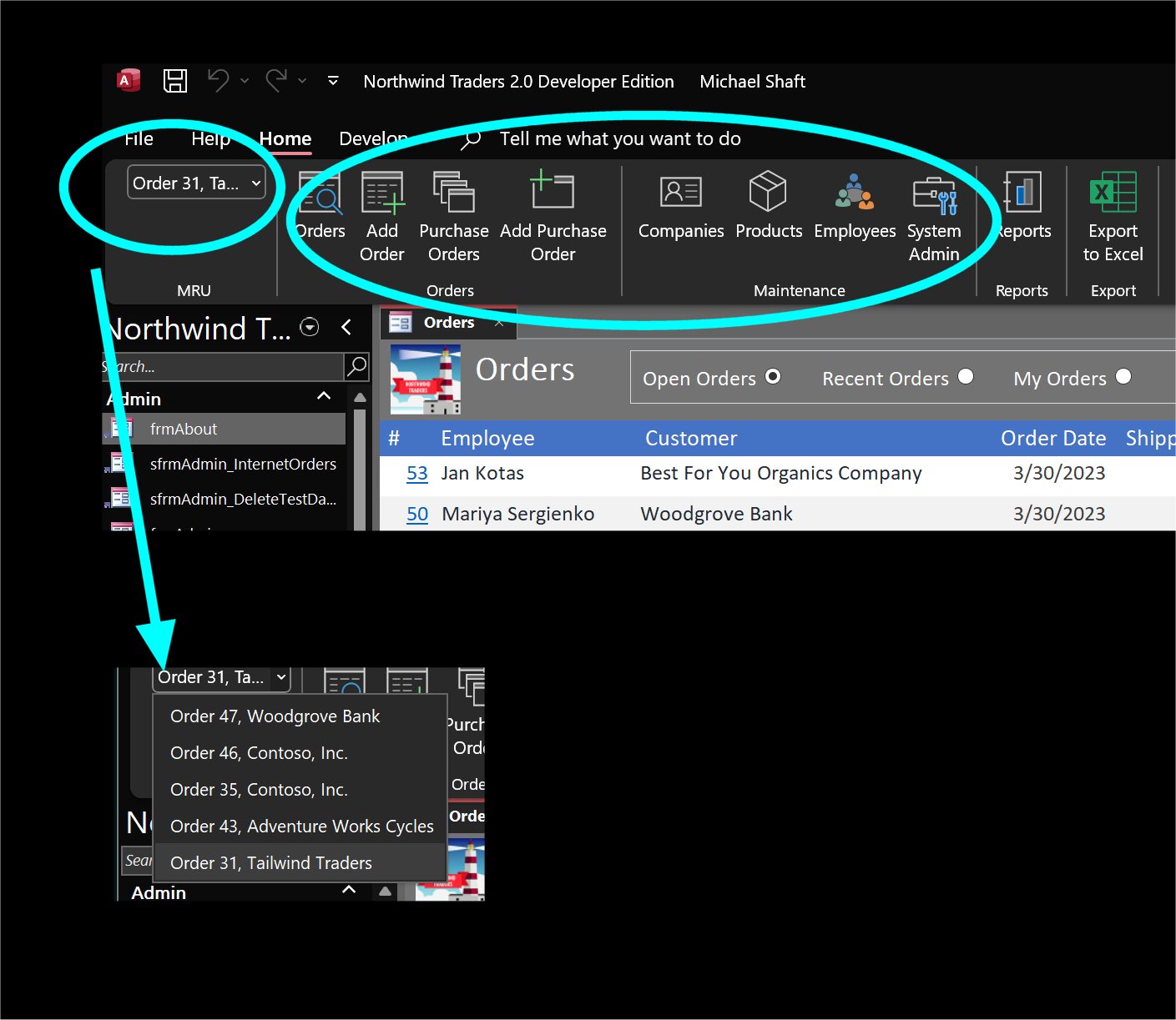 The Northwind developer edition database has a sample ribbon with all custom buttons and even a most recently used (MRU) list (picture below).  It's fascinating coding to study even if you don't use it.