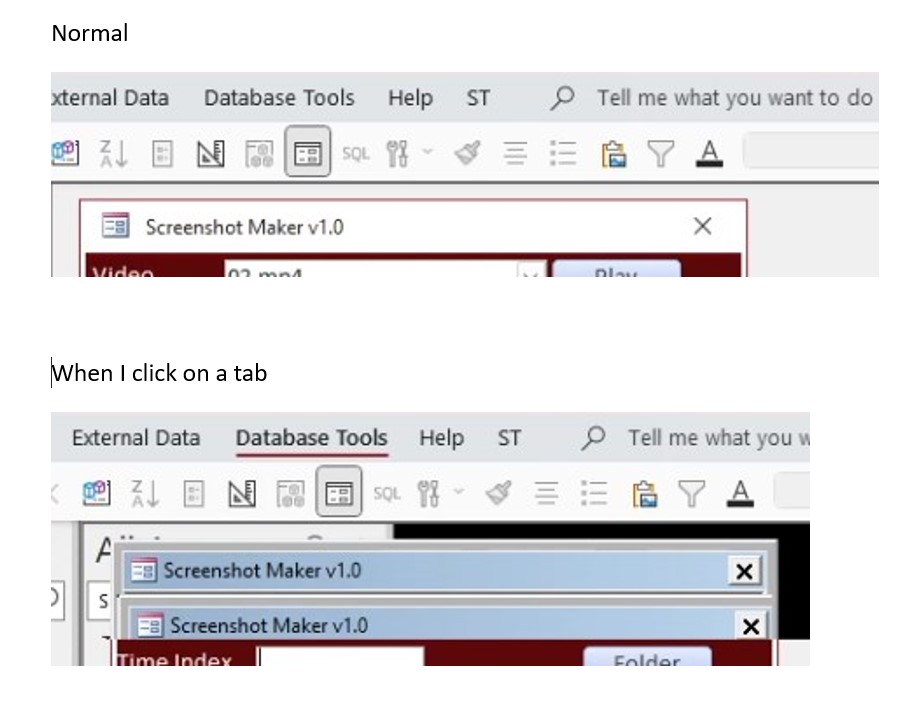 Unfortunately nothing ChatGPT suggested worked. I have removed the ribbons table from both databases, restarted the computer, and still get the shadow, even when there isn't a form loaded, I get a black shadow the width of my database when ANY tab is clicked. :(