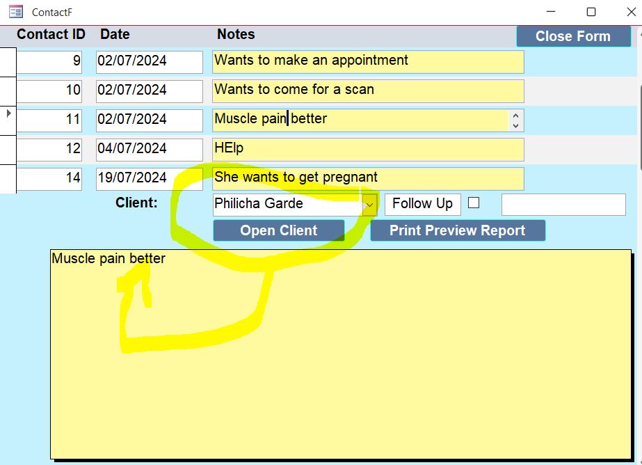 I cannot remember in which class we added the combo box for selecting the client on the contact form. I am a little confused as I see the contacts in the contact form and applicable notes, but when I select a customer in the combo box, I do not see that specific customer contacts and notes. It stays on the previous contact selected in the list. I went through that lessons again and seem to cannot find the answer. Should the customer combo box be one that select customers or just a field which shows you the name of the customer of the contact you selected. Thank you. PS: Not sure how to post screenshots in here