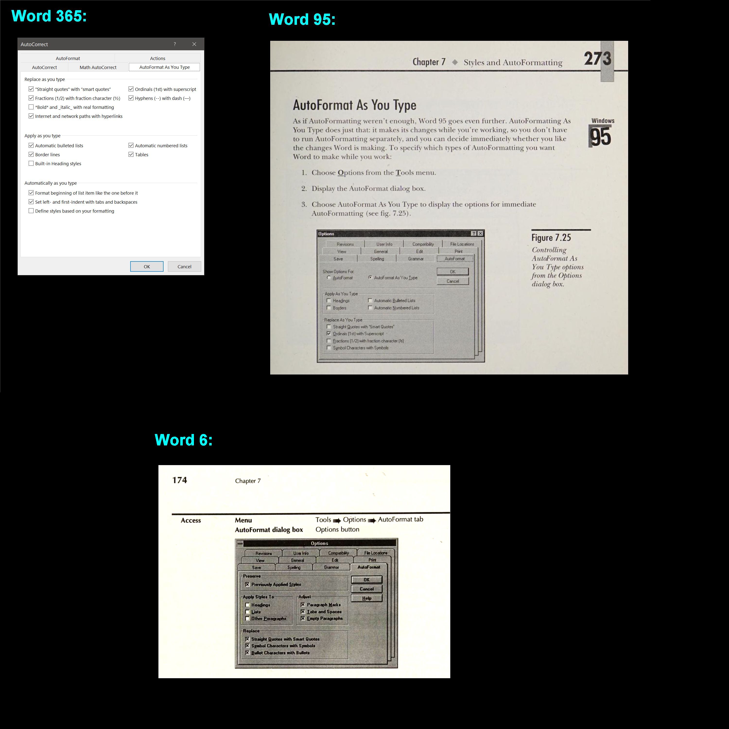 I got the older pictures by digging up old manuals of Word 6 and 95.  I went to the trouble because I wanted to prove ChatGPT wrong, once again.  As you may have noticed from my past comments, I'm not a big fan of ChatGPT.  It may be helpful if factual accuracy is irrelevant to what you ask it to do (such as making artworks).  But if you want something that you can count on to be right, then God help you if ChatGPT's result is all you have.