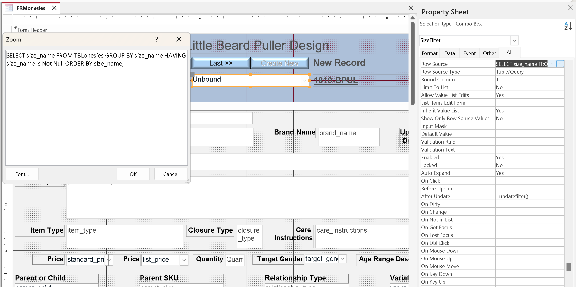 Yes I got that part, and had the "filter" at the end of the namet. But before this video I had named those boxes with a name similar to cboGoToProperty (nothing to do with the field name), and I didn't want a name that long (cboGoToPropertyFilter), so I shortened it to VARfilter and Sizefilter, not really thinking about why that would not work.
