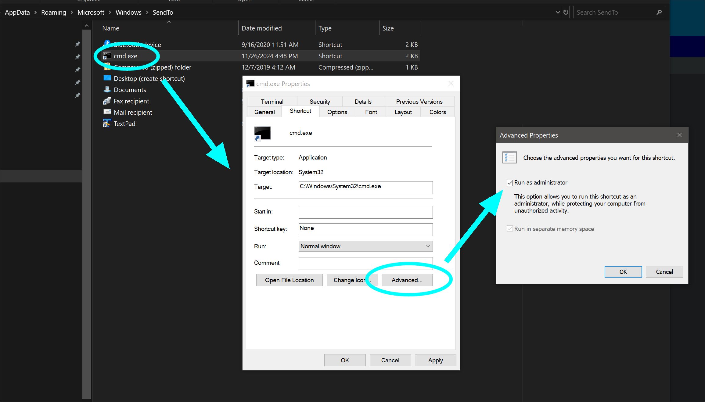The hidden "SendTo" folder is in %APPDATA%\Microsoft\Windows\SendTo.  Add a shortcut to cmd.exe as shown in the picture below.  You can also specify whether to open cmd as an administrator or not.