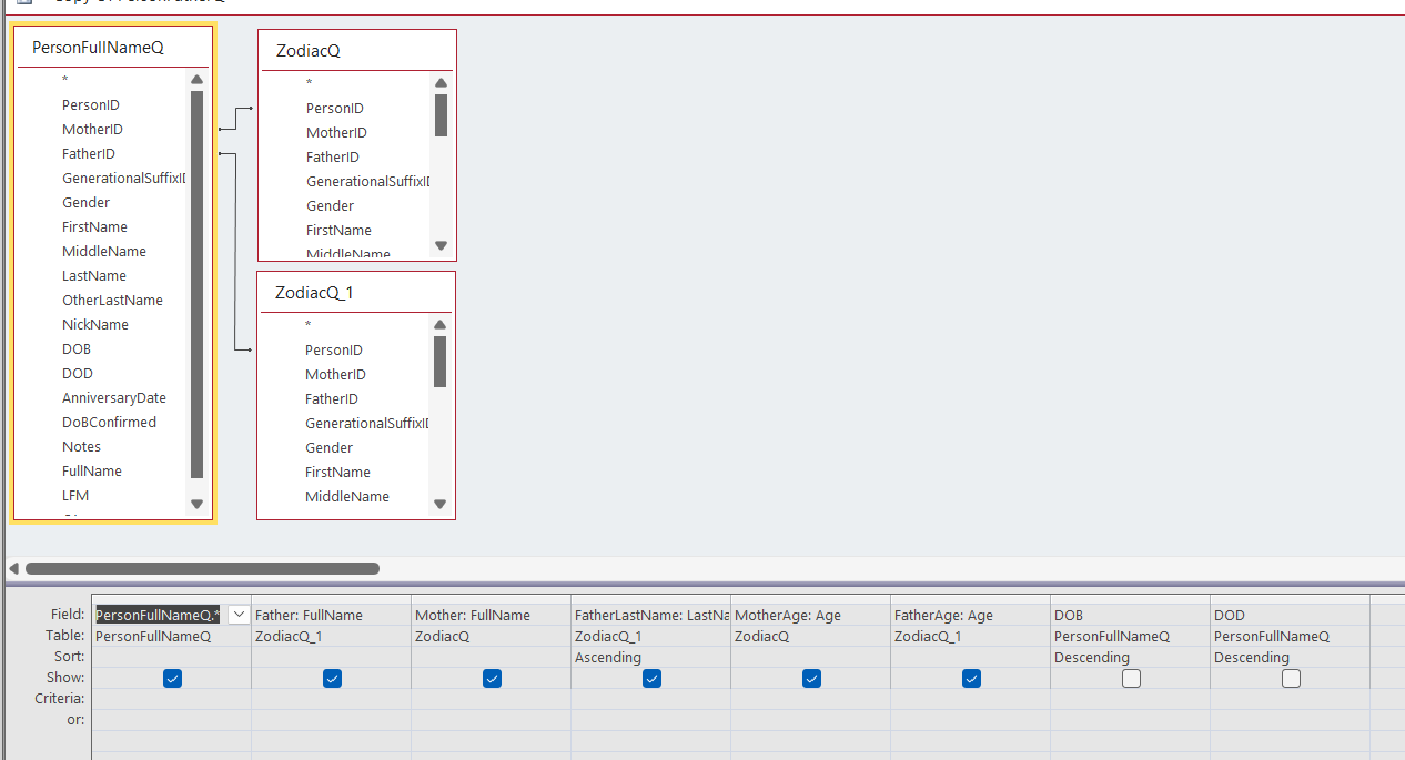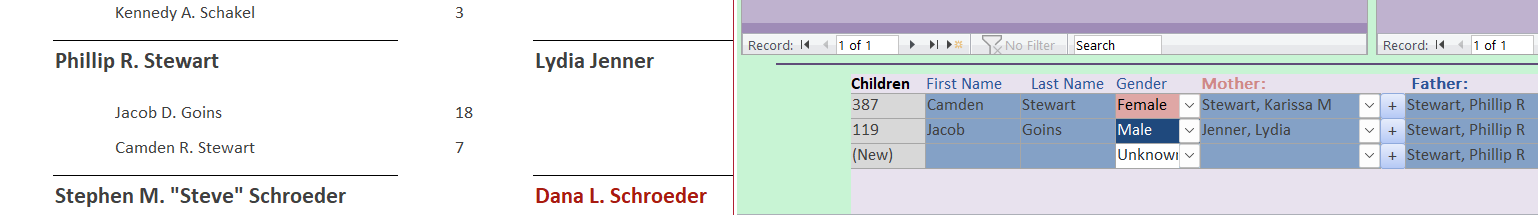 I am working in the "Genealogy Database" which I enjoy greatly. I am trying to create a report with Father/Mother and their children. The problem that I am having, is the child field is matching up with the Father, but not always matching up with the Mother. What am I doing wrong? In the report I would like to include Birthday and maybe photos.