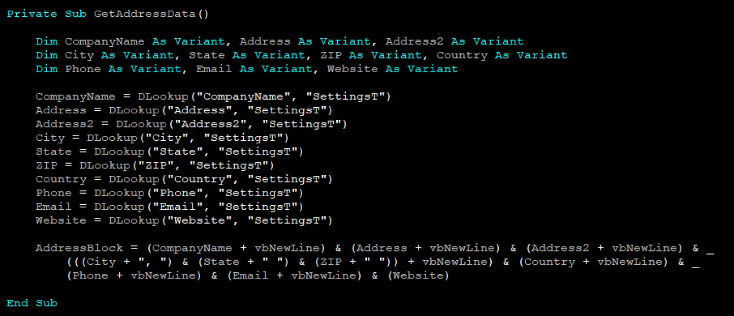 If you need to look up values using DLookup() you can't use the NZ() function as you normally would as the value would no longer be Null. Declare your variable as Variants, not Strings. You can also use vbNewLine.