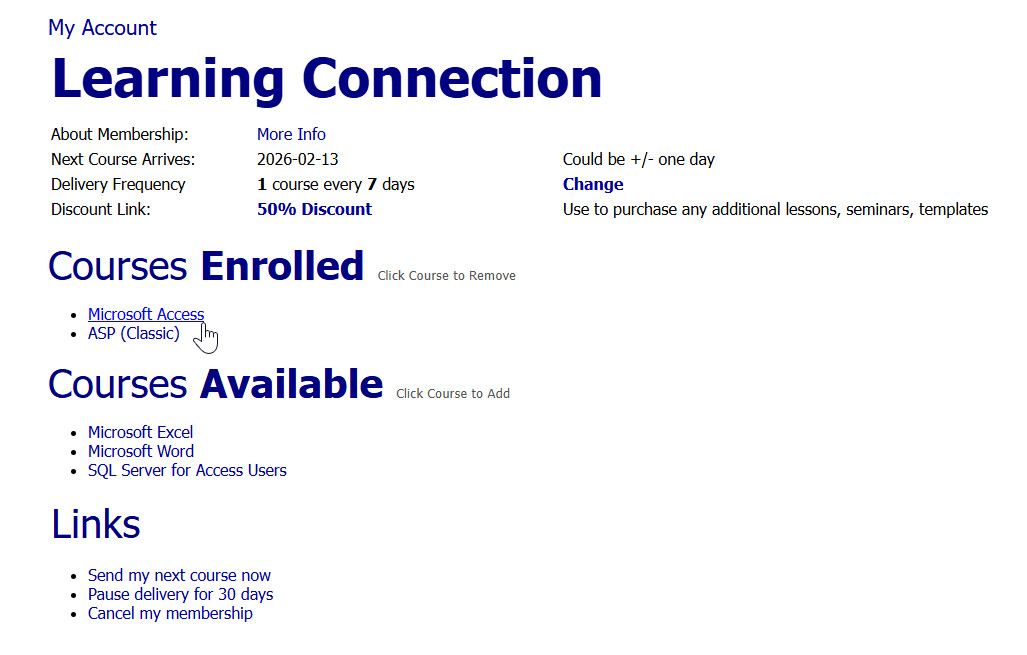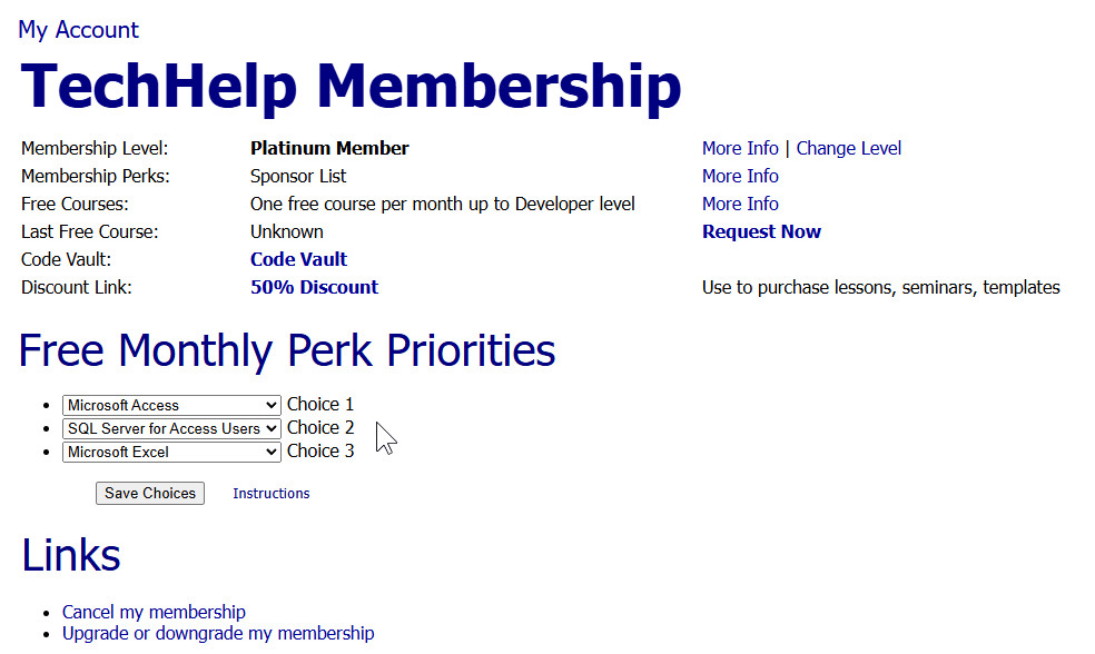 | Manage Your Techhelp Free Monthly Classes Stardate 2026.0208: While I was working on things today, I also added a new feature that lets you manage your TechHelp free monthly perk classes yourself. For example, if you're a Silver member, you get one free Beginner class each month. Since about 95% of you are here for Microsoft Access, the system has always defaulted to sending you the next Access class. Once you finished all nine Beginner lessons, it would... | |